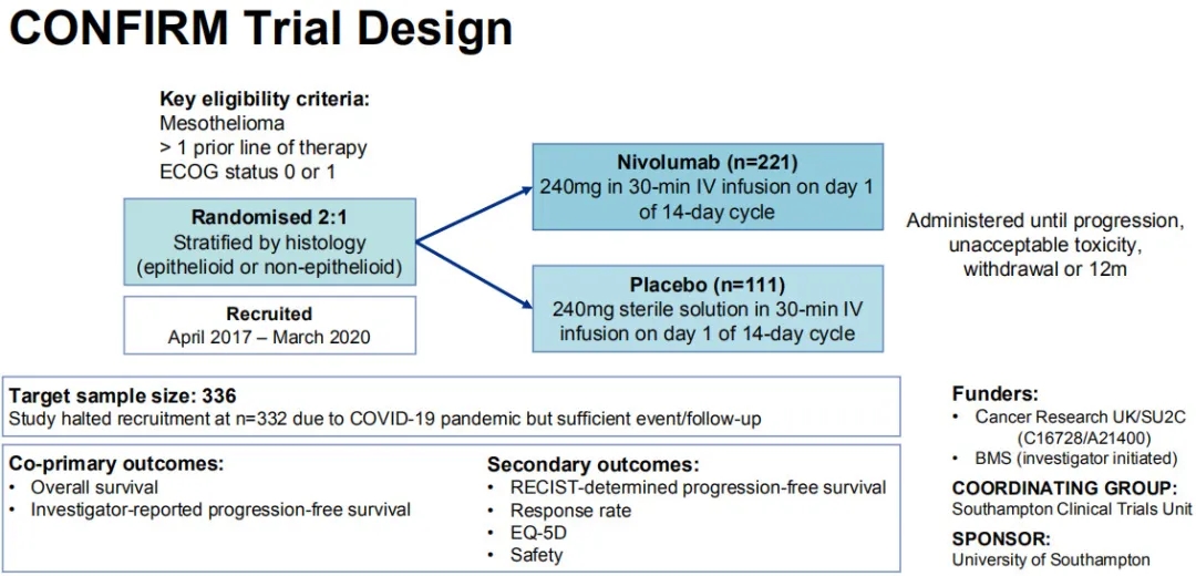 CONFIRM试验是首项在复发性间皮瘤患者中开展的抗PD-1免疫检查点抑制剂和安慰剂对照的III期试验。CONFIRM纳入既往接受过至少一种治疗、不可切除、组织学证实转移性间皮瘤的成年患者,2:1随机分配至纳武利尤单抗组(n=221)或安慰剂组(n=111)。两组患者的基线特征很平衡,纳武利尤单抗组中PD-L1肿瘤比例评分(TPS)≥1%的患者略多(37% vs. 29%),两组大部分患者(95%)的间皮瘤是胸膜起源。主要终点是OS和研究者报告的PFS。这项研究计划入组336例,随机332例患者时因COVID-19而暂停,但此时事件已足够,因此决定停止研究。