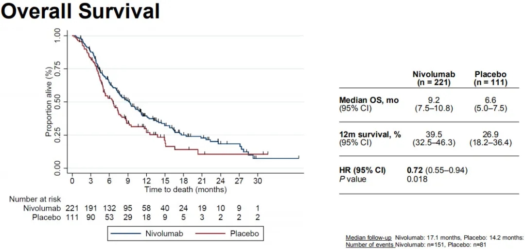 纳武利尤单抗治疗对OS有益处,中位OS分别为9.2个月(95% CI: 7.5-10.8) vs. 6.6个月(95% CI: 5.0-7.5) (HR=0.72;95%CI:0.55-0.94;P=0.02)。纳武利尤单抗组的12个月OS率为39.5%,安慰剂组为26.9%;