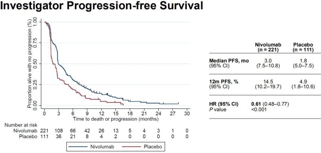 PFS数据也是纳武利尤单抗组更佳(HR=0.61;95% CI: 0.48, 0.77;P<0.001),研究者评估的PFS分别为3.0个月和1.8个月(HR=0.61; 95% CI: 0.48-0.77;P<0.001),两组的12个月PFS率分别为14.5%和4.9%;OS数据尚不成熟,因为目前只分析了约80%的目标事件,而PFS数据已成熟;