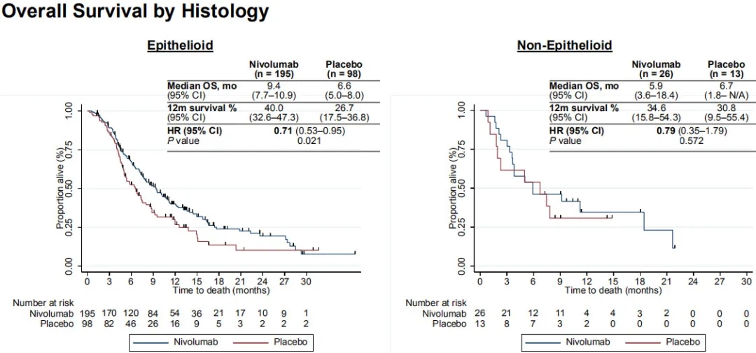 不同组织学亚型的疗效:上皮样间皮瘤患者从纳武利尤单抗治疗中获益,两组中位OS分别为9.4 vs 6.6个月,OS的HR值为0.71 (95% CI: 0.53-0.95;P=0.021),12个月OS率分别为40.0%和26.7%。然而,这种OS获益在非上皮样间皮瘤患者中未观察到,中位OS 5.9和6.7个月(HR=0.79;95% CI:0.35-1.79;P=0.572),12个月OS率分别为34.6%和30.8%;