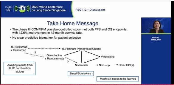 在WCLC主席研讨会上,澳大利亚悉尼大学韦斯特米德医院Rina Hui担任CONFIRM研究的点评者,她称免疫检查点抑制剂治疗复发间皮瘤的III期阳性结果是“期待已久的进步”。III期CONFIRM研究是一项阳性结果的研究,达到了两个生存终点,12个月生存率提高了12.6%。然而,哪些间皮瘤患者能从免疫治疗中获益,CONFIRM并没有发现明确的预测性生物标志物。