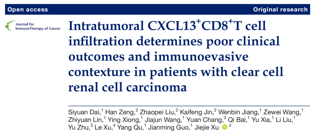 复旦大学附属中山医院郭剑明教授与复旦大学基础医学院徐洁杰教授联合研究团队,历时3年,对约300例符合入组标准的患者进行回顾性研究发现,肿瘤浸润CXCL13和CD8的双阳性T细胞,是揭示肾透明细胞癌免疫逃逸的“元凶”,“双阳性”标记可作为判断肾透明细胞肿瘤患者生存期长短的新标志,CXCL13也可作为潜在免疫治疗靶标和个体化用药的指导因子。研究为肾透明细胞癌患者预后预测模型的改良以及免疫治疗的个体化选择提供了新方向。2月16日,该成果被刊登在国际学术期刊《Journal of Immunotherapy for Cancer》(IF=10.252)。