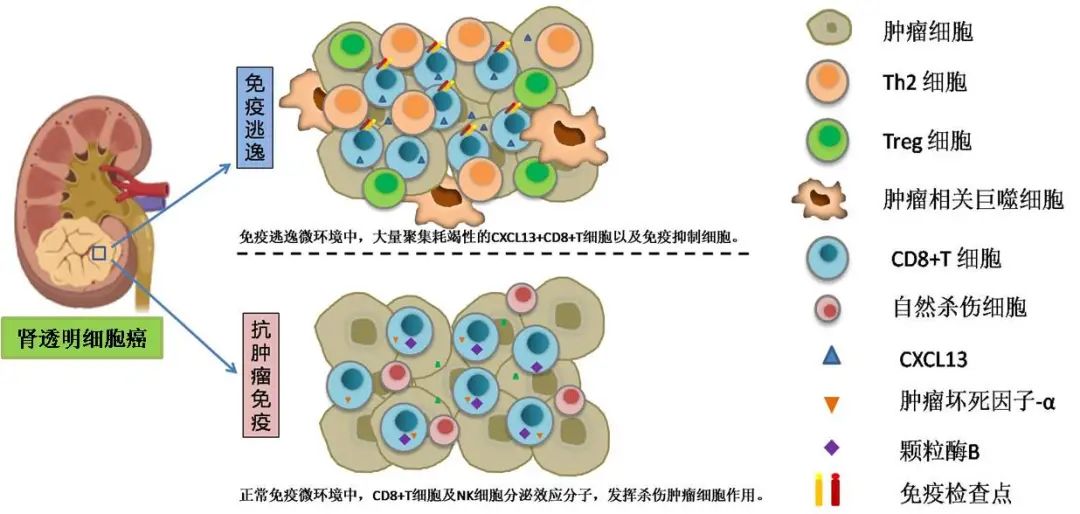 近年来CheckMate-025、CheckMate-214等研究的发布标志着晚期肾癌治疗从靶向治疗时代转向免疫治疗时代。肿瘤微环境是肿瘤发生发展的“温床”,与免疫逃逸形成和免疫治疗疗效密切相关。肾癌免疫突变负荷相对较低,但微环境中浸润着丰富的免疫细胞及因子,其中调节性免疫细胞及因子就好比肿瘤温室中的“温控开关”,通过诱导T细胞向失能表型分化,促进免疫逃逸的形成。国内外研究发现肾癌中CD8+T细胞高浸润代表差的生存结局,这与大多数实体肿瘤并不相同。在肾癌中浸润的CD8+T细胞多处于失能状态并促进免疫逃逸形成,因此锁定其中发挥关键“叛变”作用的特定CD8+T细胞亚群对预测患者预后和筛选治疗敏感人群具有重要意义。