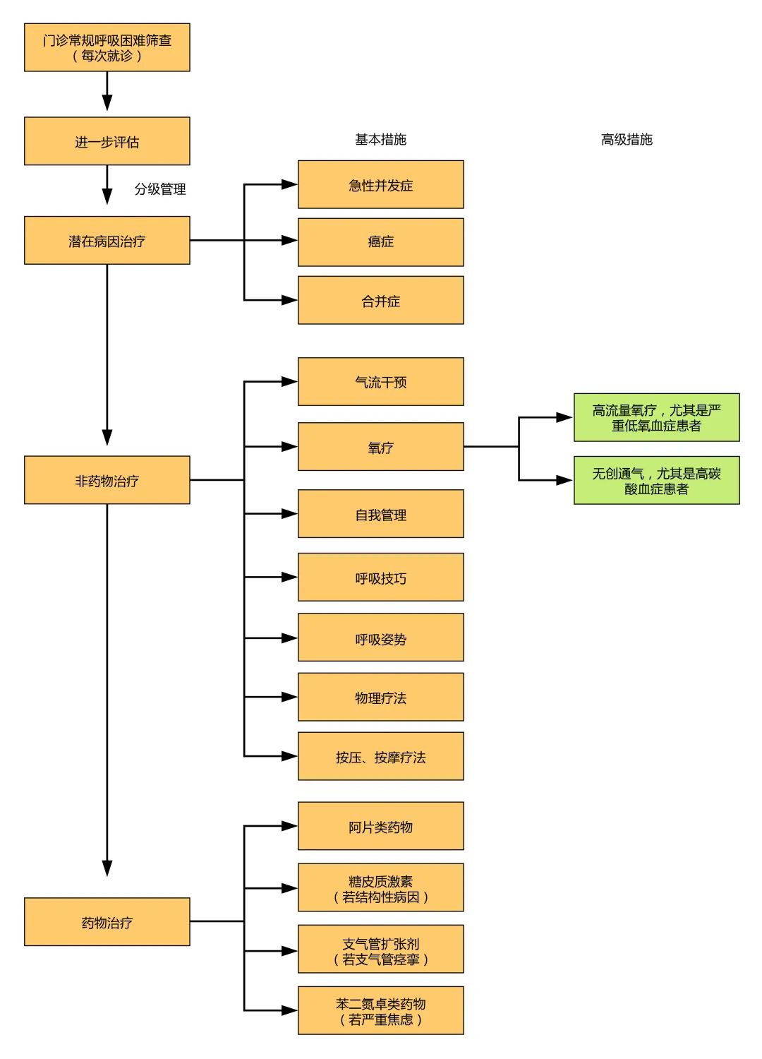 在门诊环境中,患者可能出现限制其日常活动的慢性呼吸困难。建议采用分层方法逐步引入干预措施,包括针对可逆原因的治疗、姑息治疗咨询、非药物措施和药物措施。