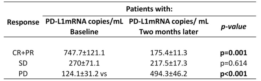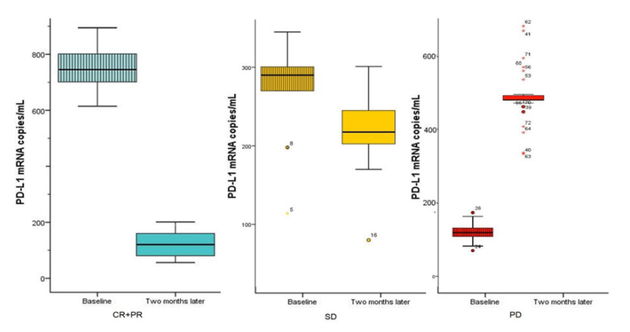 在28例达到完全缓解(CR)和部分缓解(PR)的患者中,PD-L1 mRNA平均水平显著高于49例稳定疾病(SD)或进展疾病(PD)的患者(785.6 vs 114.7 copies/ml,P<0.001)。