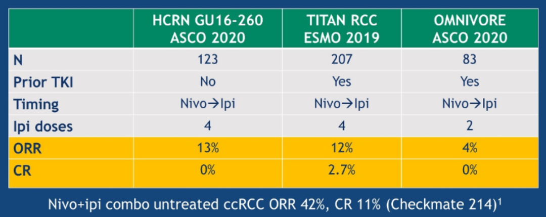 此外,一些研究也探讨了双免治疗中的序贯策略,比如2020年ASCO报道的OMNIVORE研究,若纳武单抗一线治疗获得PR/CR(≥6个月),肿瘤再次进展时再恢复用药;而SD/PD患者给予联合伊匹木单抗的挽救治疗,可获得4%的ORR。另一项HCRNGU16-260研究的策略相似,NIVO序贯IPI的ORR为13%。