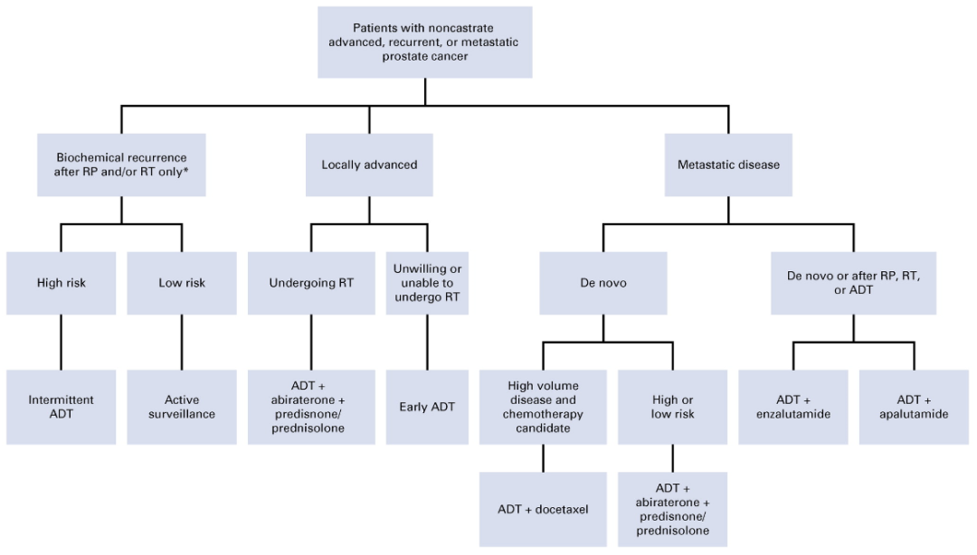 • 对于转移性非去势前列腺癌,包括先前接受过放疗但未发生进展的患者,应考虑ADT联合多西他赛、阿比特龙、恩扎卢胺或阿帕鲁胺。