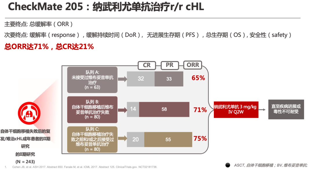 另外,更重要的新药是关于免疫检查点抑制剂在HL中的应用。进口的O药(Opdivo,Nivolumab)和K药(Keytruda,Pembrolizumab)获得相应批准在中国上市,几乎同时我们国家自主研发创新的新药PD-1陆续上市(图2)。截至目前,我们作为牵头单位进行临床试验上市的就有恒瑞公司的PD-1、百济的PD-1、陆续还将有誉衡的PD-1和康方的PD-1等其他厂家的产品。这一类新药也对复发的经典型霍奇金淋巴瘤病人带来了极好的疗效。