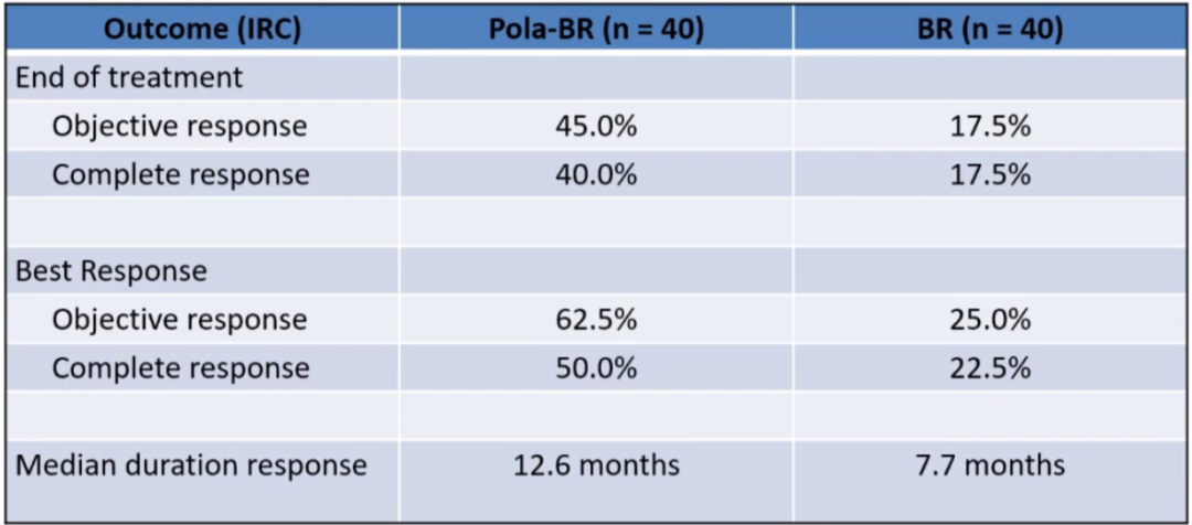 表1: Pola联合BR及单纯BR治疗R/R DLBCL的临床应答率