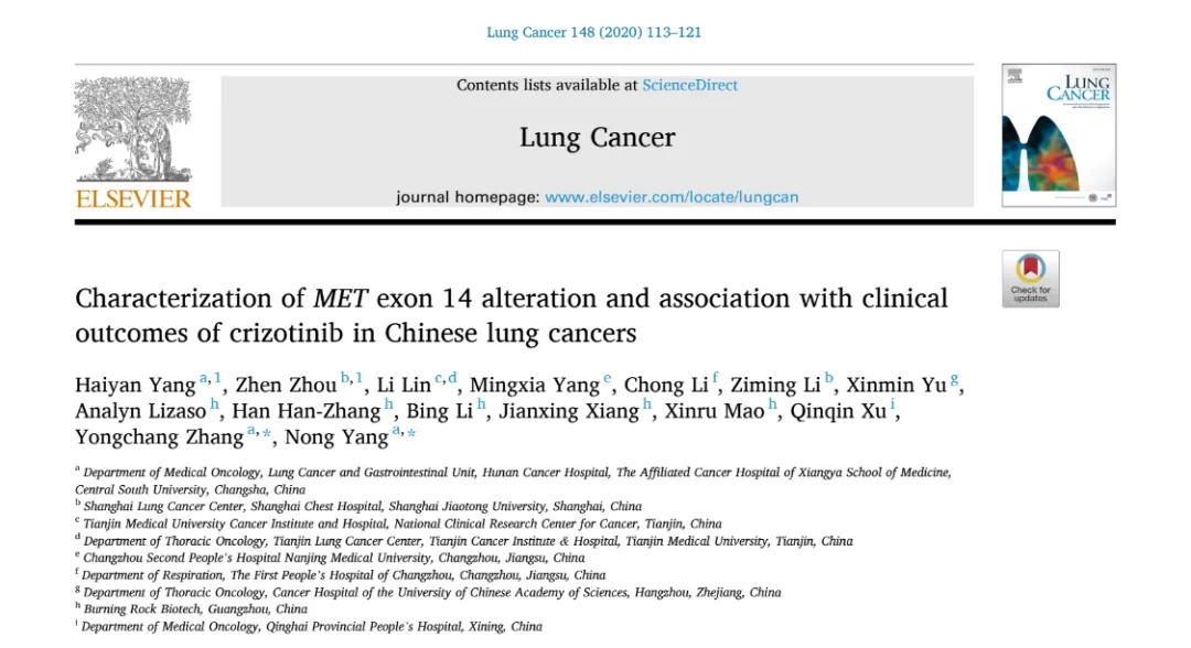 [1] Yang HY, Zhou Z, Lin L,et al. Characterization of MET exon 14 alteration and association with clinical outcomes of crizotinib in Chinese lung cancers. Lung Cancer 148 (2020) 113–121.