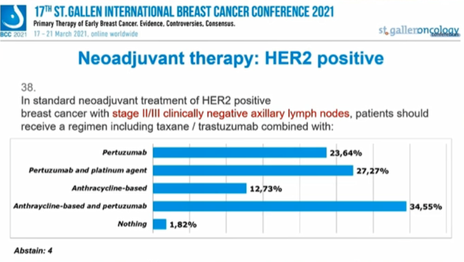 编者按:当地时间3月20日,在Eric Winner教授的主持下,第十七届圣加伦国际乳腺癌大会(SG-BCC 2021)的专家完场了首场投票,本文总结“新辅助治疗”以及“新辅助治疗后”的专家投票结果。