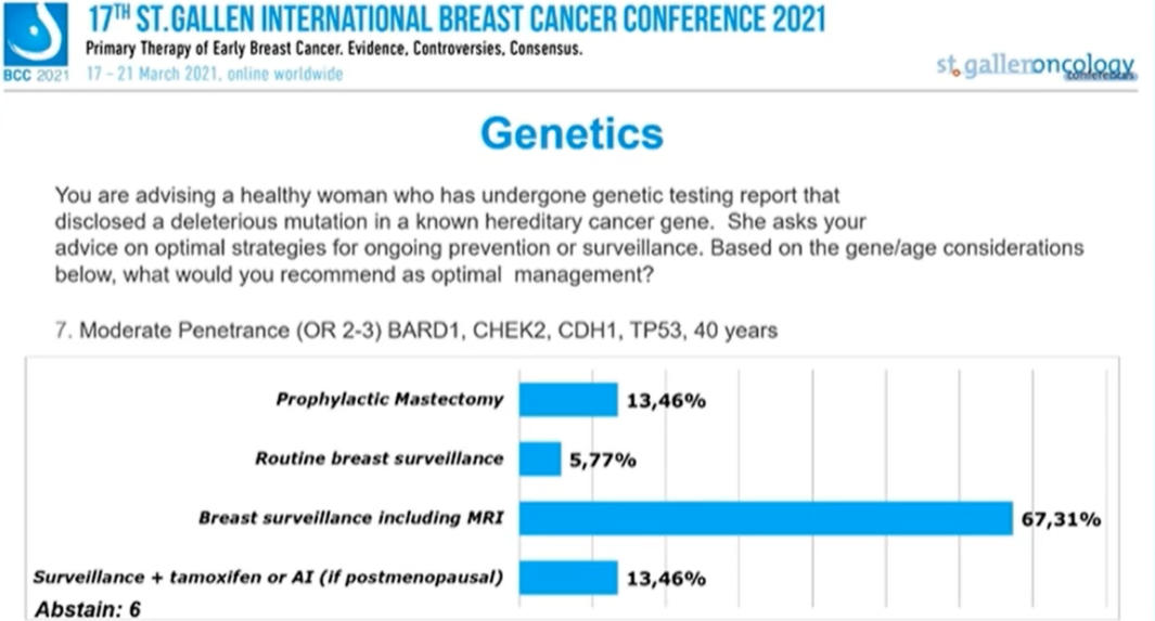 若高外显率(OR>3)BRCA1,BRCA2,PALB2,年龄60岁,46%的专家选择“预防性乳房切除”,8%的专家选择“常规乳房监测”,32%的专家选择“包括MRI在内的乳房监测”,14%的专家选择“TAM/AI+监测(如果为绝经后患者)”,9人弃权。