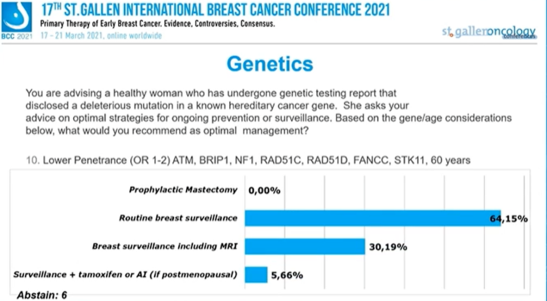 低外显率(OR 1~2)ATM,BRIP1,RAD51C,NF1,RAD51C,RAD51D,FANCC,STK11,年龄60岁,没有专家选择“预防性乳房切除”,64.15%的专家选择“常规乳房监测”,30.19%的专家选择“包括MRI在内的乳房监测”,5.66%的专家选择“TAM/AI+监测(如果为绝经后患者)”,6人弃权。