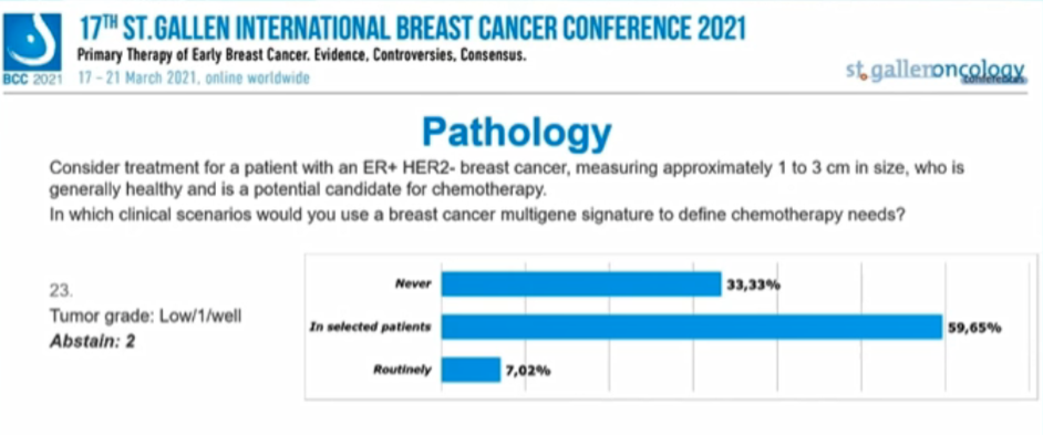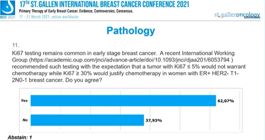 Ki67检测在早期乳腺癌中仍然很常见。最近有国际工作组在ER+/HER2- T1-2N0-1的乳腺癌患者中推荐了这样的检测方案:预期Ki67≤5%的肿瘤不需要化疗,而Ki67≥30%的肿瘤需要化疗,你同意吗?