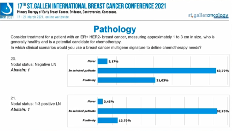 对于腋窝淋巴结1-3枚阳性患者,“从不考虑”、“选择性”、“常规”选择多基因检测的专家比例分别为3.45%、82.76%、13.79%。