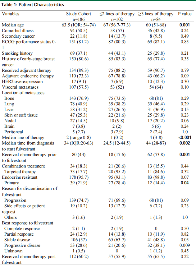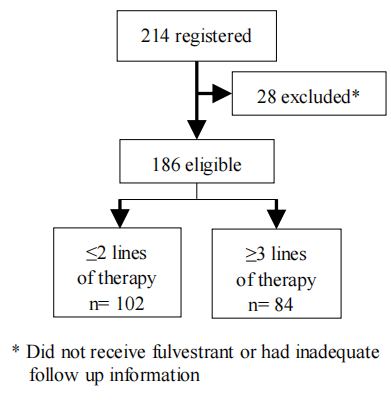 这项基于人群的回顾性多中心队列研究,通过对2003年~2019年在加拿大萨斯喀彻温省获得氟维司群治疗HR+mBC女性患者个人病历的评估,查找符合条件的患者。通过多因素Cox生存分析,来确定疾病进展时间(TTP)和总体生存时间(OS)。主要目的:比较经过2个或更少疗程(≤2线)后开始服用氟维司群的患者与之前接受过3个或更多疗程(≥3线)的患者的TTP和OS。次要目的:比较氟维司群在以前对内分泌治疗敏感(继发耐药)和不敏感(原发耐药)的患者以及有内脏转移的患者和无内脏转移的患者中的疗效。