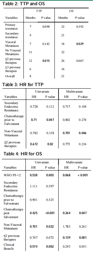 在多变量分析中,自诊断为mBC≥34个月后开始使用氟维司群的HR为0.66(0.46~0.95),无内脏转移患者HR为0.69(95%CI:0.49~0.98),使用氟维司群化疗与TTP改善显著相关;氟维司群+化疗的HR为0.34(0.23~0.49),氟维司群临床获益(CBR;部分缓解/疾病稳定)与较好的生存率相关HR为0.45(0.31~0.68),无内脏转移患者的HR为0.66(0.47~0.92)。