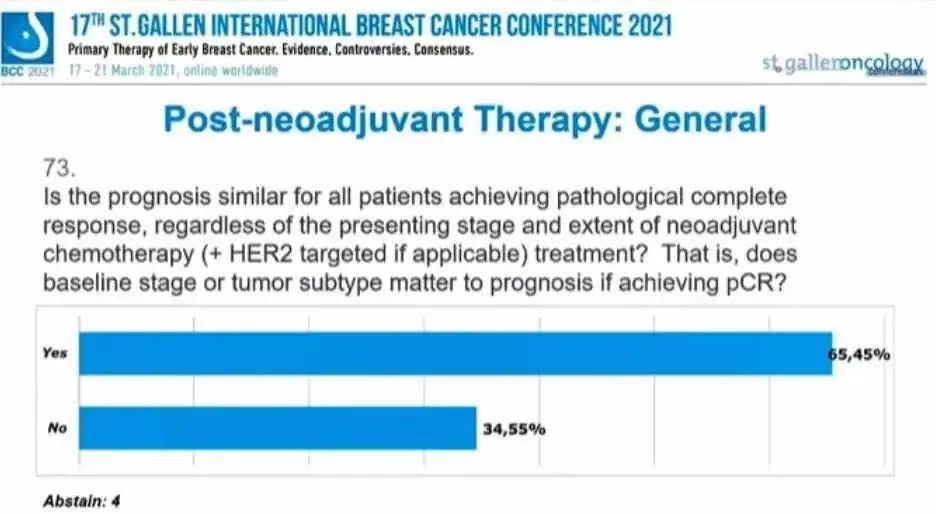图2:无论当前分期以及新辅助治疗强度(在可及的情况下联合HER2靶向治疗),所有获得pCR的患者预后是否都相似?也就是说,如果达到pCR,基线肿瘤分期或肿瘤亚型对预后有影响吗?65.45%的专家选择“是”,34.55%的专家选择“否”,另有4人弃权。