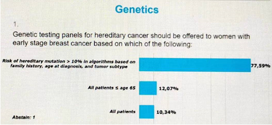 图1:应根据以下哪些条件为有癌症家族史的早期乳腺癌女性提供基因检测?77.59%的专家选择“遗传突变风险>10%,其突变风险根据家族史,诊断年龄和肿瘤亚型综合评判”,12.07%的专家选择“所有年龄≤65岁的患者”,10.34%的专家选择“所有患者”,1人弃权。