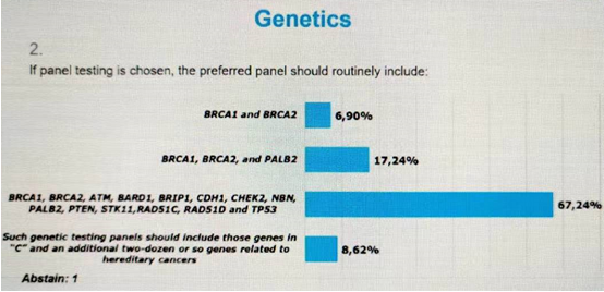 图2:乳腺癌基因检测Panel应优选哪些基因?6.9%的专家选择“BRCA1和BRCA2”,17.24%的专家选择“BRCA1,BRCA2和PALB2 3”,67.24%的专家选择“BRCA1,BRCA2,ATM,BARD1,BRIP1,CDH1,CHEK2,NBN,PALB2,PTEN, STK11,RAD51C,RAD51D和TP53”;8.62%的专家认为首选的基因检测应该包括“BRCA1,BRCA2,ATM,BARD1,BRIP1,CDH1,CHEK2,NBN,PALB2,PTEN, STK11,RAD51C,RAD51D和TP53中的基因,以及另外20多个与遗传性癌症有关的基因”,1人弃权。