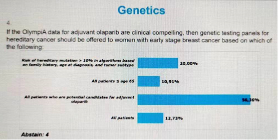 图3:如果OlympiA奥拉帕利辅助治疗研究的数据具有临床说服力,那么应根据以下哪种情况为早期乳腺癌患者提供遗传性癌症的基因检测?20%的专家选择“遗传突变风险>10%,其突变风险根据家族史,诊断年龄和肿瘤亚型综合评判”。10.91%的专家选择“所有年龄≤65岁的患者”,56.36%的专家选择“奥拉帕利辅助治疗潜在获益的患者”,12.73%的专家选择“所有患者”,4人弃权。
