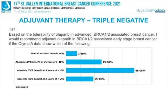 而当OlympiA研究的疗效相比标准方案达到多少获益时,会推荐奥拉帕利作为辅助治疗?傅佩芬教授所在医院参加了OlympiaA研究,因我国BRCA突变患者较少,筛选的一百多例患者中仅成功入组近10例患者,研究过程十分艰辛,傅教授期盼奥拉帕利能为BRCA突变的ER阳性、三阴性乳腺癌患者带来福音。既往研究中,袁中玉教授团队的SYSUCC001对TNBC使用卡培他滨的延长辅助治疗,5年DFS绝对获益达10%;CREATE-X研究对TNBC新辅助治疗后non-pCR患者使用卡培他滨强化辅助治疗,5年DFS绝对获益约7%;邵志敏教授领衔的 CBCSG010辅助治疗联合卡培他滨5年的DFS绝对获益改善6%左右,因此,OlympiaA研究三年iDFS绝对获益最少改善5%才能符合大家的期待。