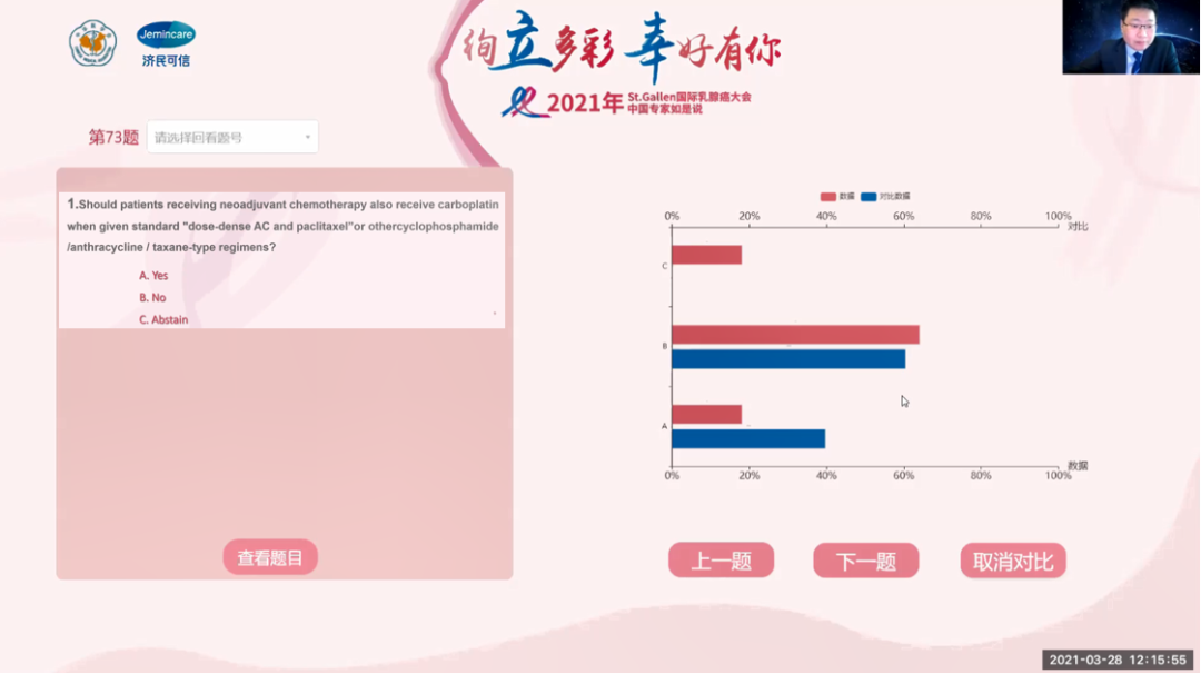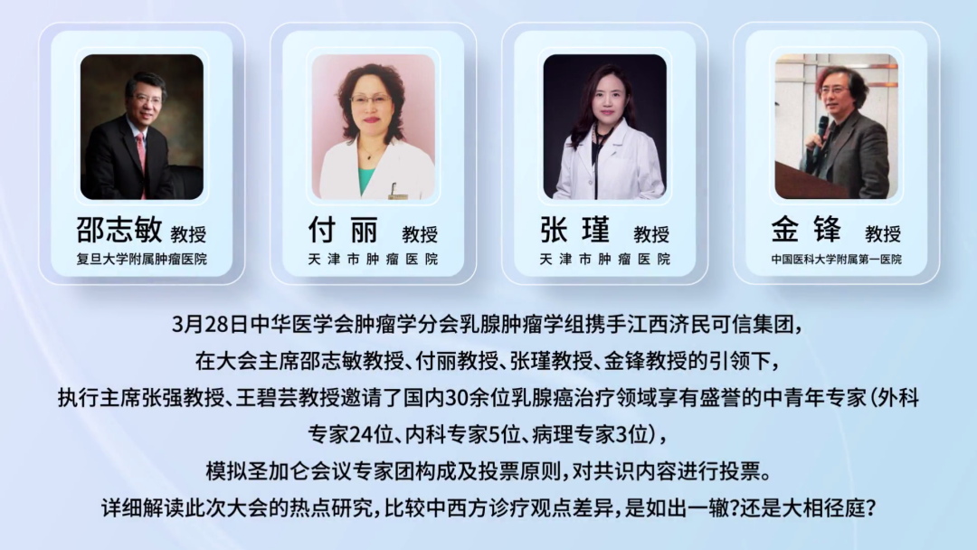 3月28日,由中华医学会肿瘤学分会乳腺肿瘤学组主办、江西济民可信集团支持举办的“绚立多彩,幸好有你——2021年St.Gallen国际乳腺癌大会中国专家如是说”专题会议在线上顺利举行。国内30余名乳腺癌中青年专家模拟SG-BCC会议现场,在最新循证医学证据指导下,对早期乳腺癌的若干诊疗问题进行讨论和投票。