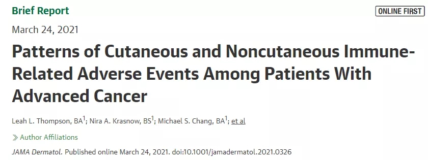 Leah L. Thompson, BA; Nira A. Krasnow, BS; Michael S. Chang, BA; et al. Patterns of Cutaneous and Noncutaneous Immune-Related Adverse Events Among Patients With Advanced Cancer. JAMA Dermatol. Published online March 24, 2021. doi:10.1001/jamadermatol.2021.0326.