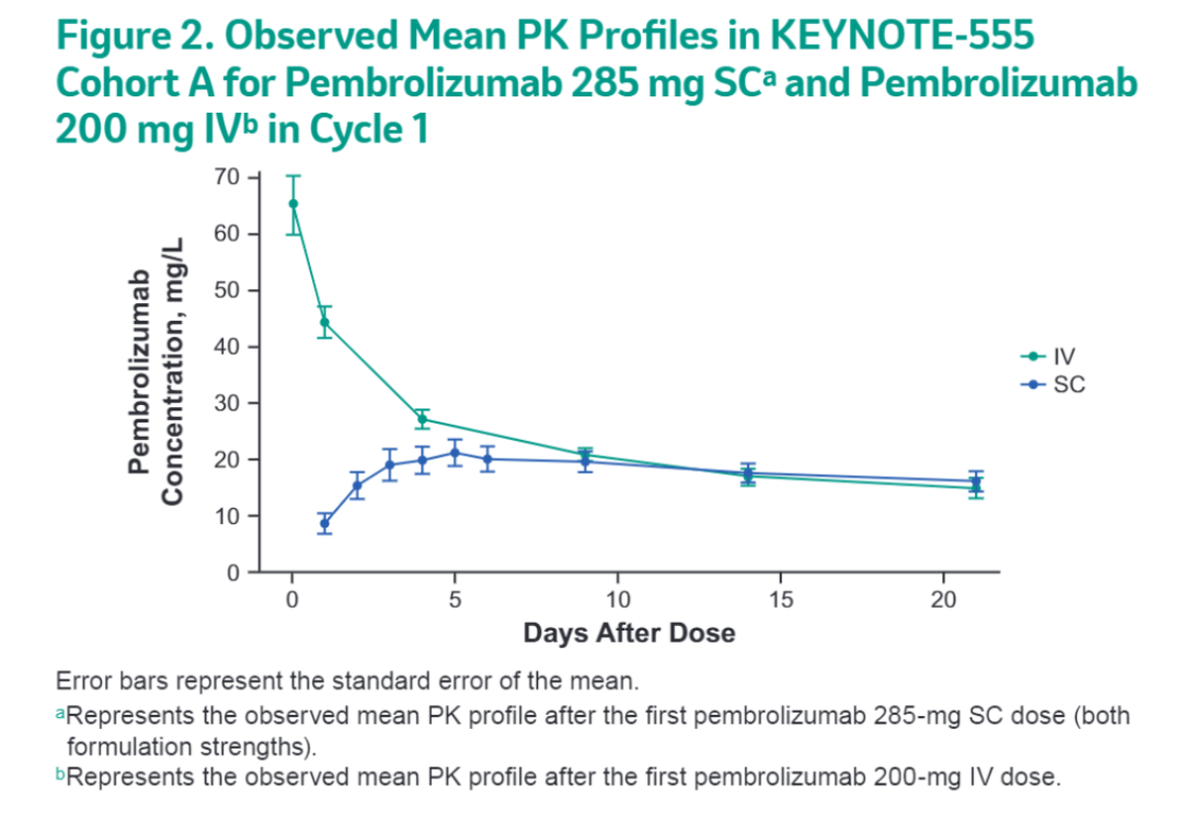 研究背景:帕博利珠单抗被批准用于多种肿瘤,剂量为200mg或2mg/kg Q3W或400mg Q6W,静脉输注。KEYNOTE-555(NCT03665597)队列A是一项开放标签的I期研究,研究了2种不同浓度的帕博利珠单抗的皮下制剂(SC)与静脉输注(IV)的相对生物利用度。