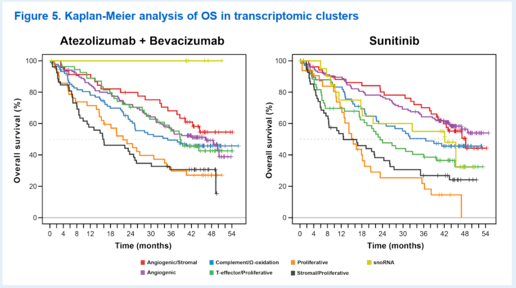 研究背景:IMmotion151(NCT02420821)研究揭示了作为一线治疗药物的Atezo(anti-PD-L1)联合Beva(anti-VEGF)对比Suni能提高转移性肾癌患者的PFS(2019年Lancet)。肿瘤组织的基因表达分析表明7个转录组分类和ORR和PFS有关(2020年Cancer Cell)。最终OS、安全性和OS相关转录组在本次摘要进行展示。