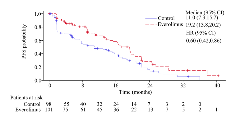 图5. BOLERO-4研究依维莫司一线治疗的PFS生存曲线