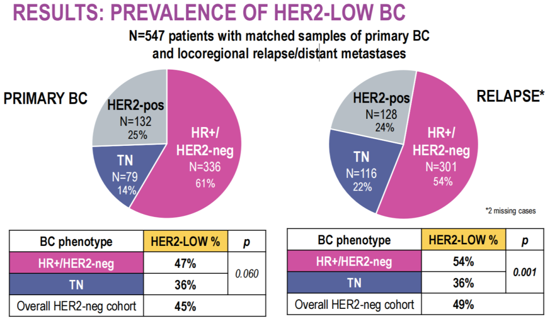 编者按:约有一半的分类为HER2阴性的乳腺癌表现出HER2低表达(IHC1+或IHC2+和ISH阴性),这种表达的乳腺癌患者可经新的抗体-偶联药物靶向治疗。而目前没有关于HER2低表达状态从原发肿瘤到复发的演变数据。意大利研究者对该类乳腺癌进行了探索,并将研究结果在本届ESMO BC大会上进行了披露。