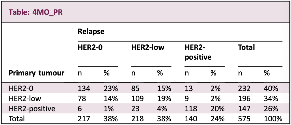 结果:共纳入575例乳腺癌患者。原发肿瘤表型为:Luminal型(HR+/HER2阴性)占59%,HER2阳性占25%,三阴性占16%。HER2低表达病例在原发性肿瘤中的比例为34%,在复发性肿瘤中为38%。在HER2阴性病例中,HER2低表达在Luminal型中比在三阴性乳腺癌中更为常见(原发性乳腺癌样本分别为47%vs 41%,P=0.268;复发样本为54%vs 40%,P=0.006)。总体HER2不一致率为38%(Table:4 MO-PR),主要由HER2 0转为HER2低表达(15%)和HER2低表达转为HER2 0(14%)。少数病例(9%)HER2状态发生改变(HER2由阳性转为阴性或HER2阴性转为阳性)。在HER2阴性原发乳腺癌中,HER2不一致的比率在Luminal型中高于三阴性的病例(45%vs 35%,P=0.0080)。这种差异主要是由HER2 0转为HER2低表达的病例引起的:Luminal型/HER2 0的病例为40%,而三阴性/HER2 0的病例为24%(P=0.088)。