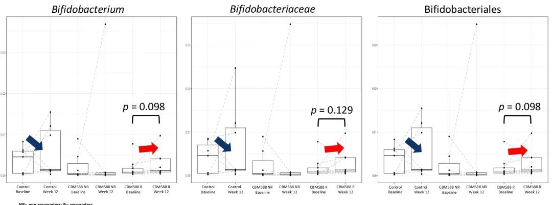 研究方法:我们进行了一项开放性随机研究,主要入组标准为确诊的透明细胞和/或肉瘤样mRCC、IMDC为中等/不良风险和转移性疾病并且未接受系统性治疗。患者按2:1随机分为N/I+CBM-588组和N/I组,每3周静脉注射3mg/kg N和1mg/kg I,持续12周,然后每4周静脉注射480mg N。CBM-588口服剂量为80mg bid(图1)。在基线检查和12周时收集粪便进行细菌分析并进行宏基因组测序(Dizman等 Cancer-Med 2020)。研究的主要终点是从基线检查到第12周双歧杆菌属的变化。次要终点包括微生物多样性的变化和临床结局,包括有效率(RR)和无进展生存期(PFS)。