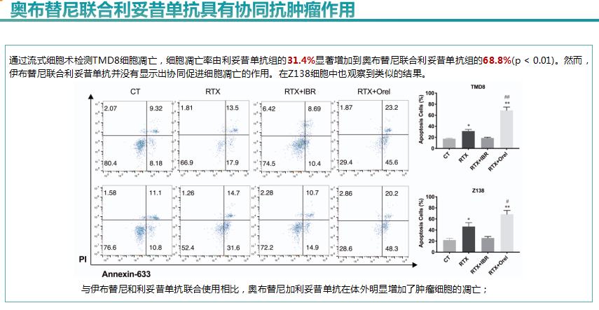 图3:奥布替尼+利妥昔单抗可增加B淋巴瘤细胞的凋亡,两者具有协同作用