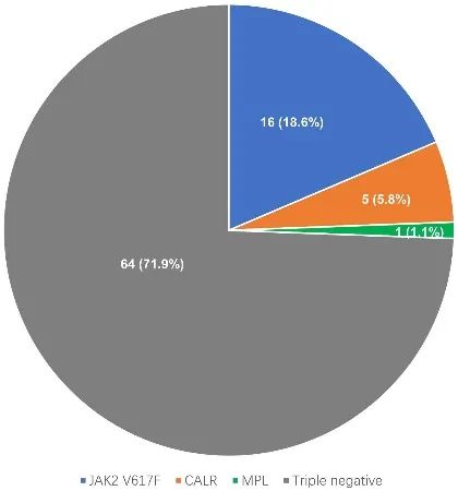 结果显示,中位年龄为10岁(1~16岁),中位随访时间为61个月(6~188月)。我们对最新检测的数据进行了更新,发现86例患者中JAK2 V617F突变阳性者16例(18.6%),中位突变负荷为12.3%(3.4~79.5%),CALR基因突变的患儿5例(5.8%),MPL基因突变的患儿1例(1.1%),71.9%的患儿缺乏特异性基因突变(图1),特异性基因突变的比例显著低于成人患者。