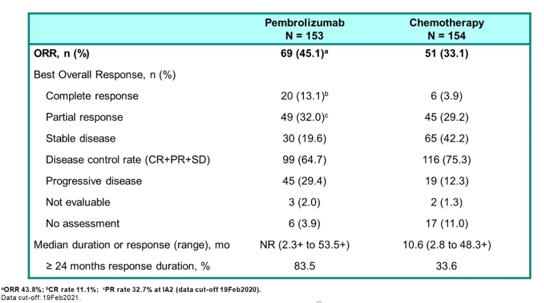 ORR方面,数据截至2021年2月19日的最新分析显示,帕博利珠单抗组患者的总缓解(完全缓解+部分缓解)率为45.1%,化疗组为33.1%,帕博利珠单抗组达到完全缓解的患者比例较化疗组更高(13.1% vs. 3.9%)(图2)。