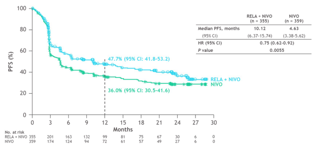 结果:714 名患者被随机分配至 RELA+NIVO组(n = 355)或 NIVO组(n = 359)。治疗组之间的患者特征基本平衡。中位随访时间为 13.2 个月。RELA+NIVO组的中位 PFS(10.1 个月 [95% CI:6.4~15.7])显着长于 NIVO 组(4.6 个月 [95% CI:3.4~5.6];风险比,0.75 [95%CI:0.6~0.9];P = 0.0055)。RELA+NIVO和 NIVO 的12个月 PFS 率分别为 47.7%(95% CI:41.8~53.2)和 36.0%(95% CI:30.5~41.6)。在各个关键亚组中RELA+NIVO组的PFS均优于对照组。