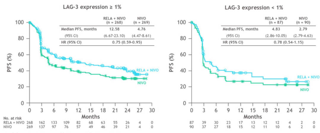 方法:既往未经治疗的晚期黑色素瘤患者按 1:1 随机接受 RELA 160 mg + NIVO 480 mg静脉输注 (IV) 或 NIVO 单药治疗 480 mg IV ,两组均为每 4 周给药一次,按 LAG-3 表达,PD-L1 表达、BRAF突变状态和 AJCC (v8) M 分期进行分层。主要终点是独立中心影像根据 RECIST v1.1 评价的无进展生存期 (PFS)。次要终点是总生存期和客观缓解率。预先指定亚组中的 PFS 和安全性是研究的额外目标。