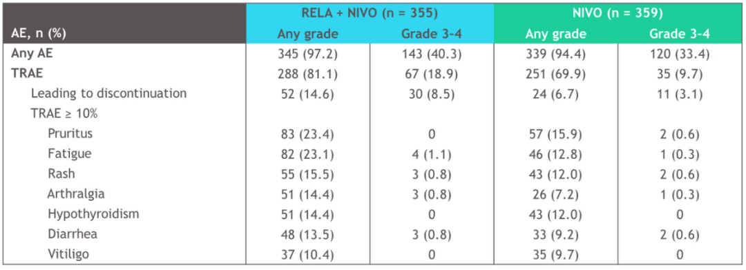 与 NIVO 组(9.7%) 相比,RELA + NIVO组 (18.9%) 的 3/4级治疗相关不良事件 (TRAE) 的发生率更高。RELA+NIVO组有 3 例与治疗相关的死亡,NIVO组有2例。导致治疗中断的TRAE(任何级别)在RELA+NIVO和NIVO 组中分别为14.6%和6.7%。