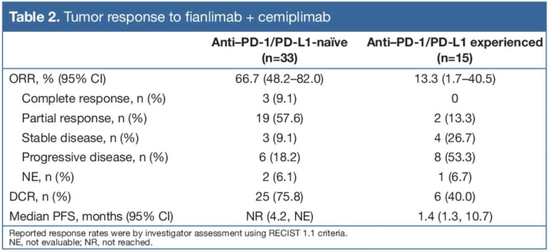 表2. Fianlimab+cemiplimab治疗晚期黑色素瘤的疗效