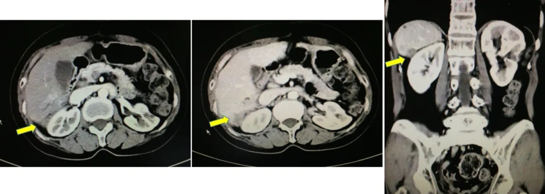 2016.10.12查CT:右肝包膜下小片状低密度影,建议复查。