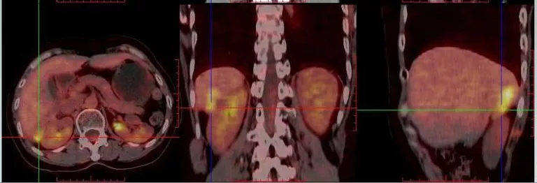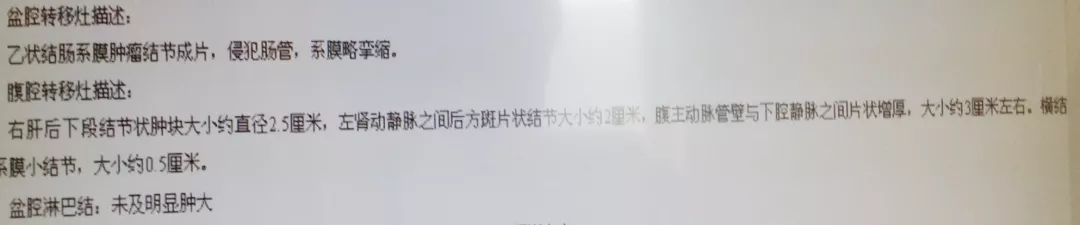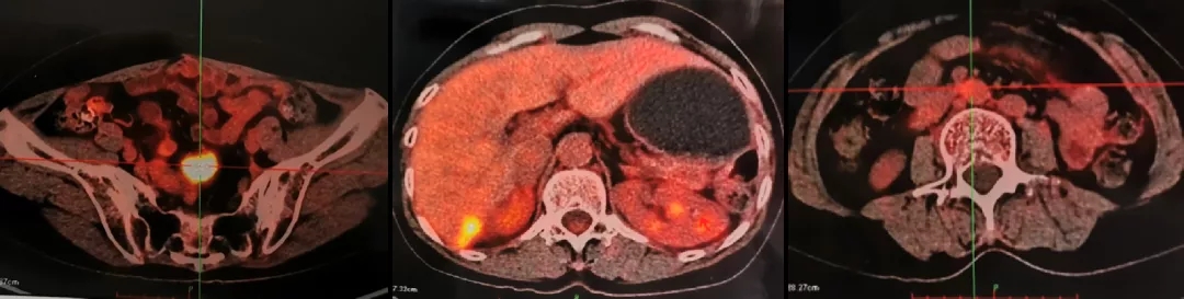 2016.10.14查PET-CT: 盆腔内软组织密度灶,FDG代谢异常增高,考虑转移灶;右肝后下段包膜处结节样、片状转移灶;左肾前方斑片状,腹主动脉管壁处(L3椎体水平)FDG代谢轻度增高,考虑肿瘤活性组织存在。