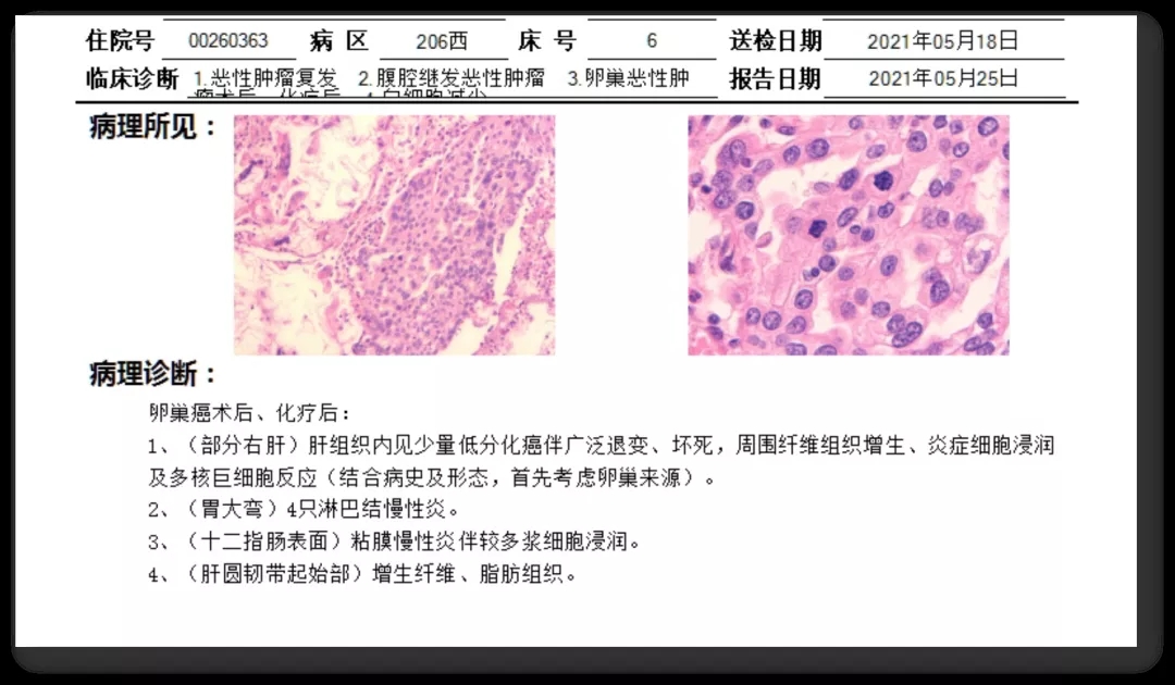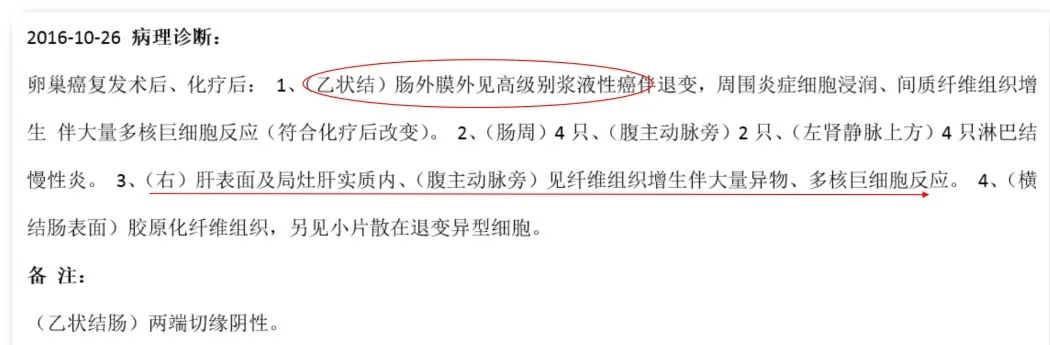 术后病理:(右)卵巢浆液性囊腺癌(中分化),累及(右)输卵管、子宫壁及(大网膜、子宫直肠窝、壁层腹膜、乙状结肠系膜、肝肾隐窝、直肠表面、左结肠旁沟、阑尾、右结肠旁沟)。(腹主动脉旁)1/3只淋巴结见癌转移。