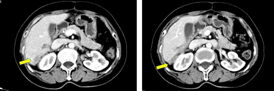 2017-10-26当地查CA125水平为46.3U/ml,2017-12-4我院查CA12水平为110.9U/ml,CT显示肝肾间隙及右肝包膜下片状影较前增大,考虑疾病复发。