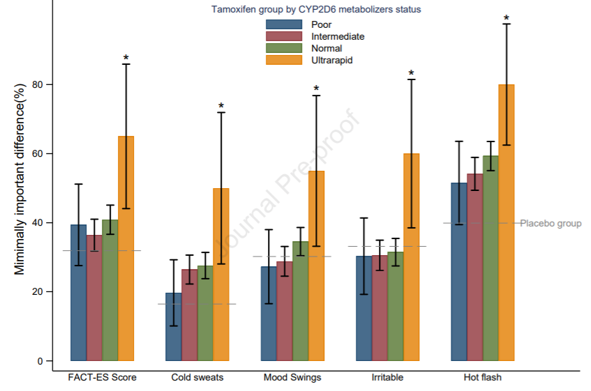 服用他莫昔芬后,CYP2D6超快代谢型比其他代谢型女性更有可能报告出冷汗、潮热、情绪波动、易怒等治疗不良反应,FACT-ES得分结果也相似。
