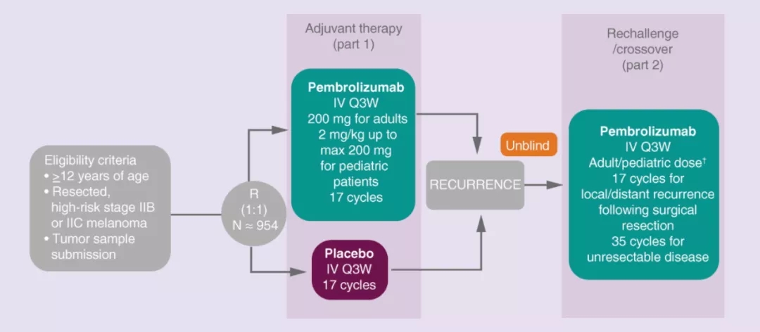 该研究入组约964例≥12岁、已切除的、高危IIB或IIC黑色素瘤患者,给予17个疗程的帕博利珠单抗或安慰剂辅助治疗。2021年8月5日,MSD宣布该研究达到主要终点,帕博利珠单抗可显著改善患者RFS。