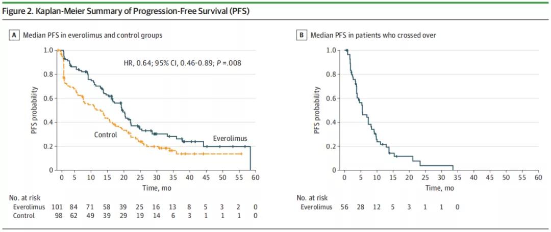 在次要终点方面,依维莫司组ORR(50.0% vs 39.3%)、CBR(72.7% vs 47.5%)、DoR(18.7 vs 14.8个月)也有不同程度改善。令人欣喜的是,53例由来曲唑交叉至依维莫司联合治疗的患者,也额外获得了5.5个月的PFS(95%CI:3.8~8.2个月),进一步证明应用依维莫司可以逆转来曲唑的耐药。