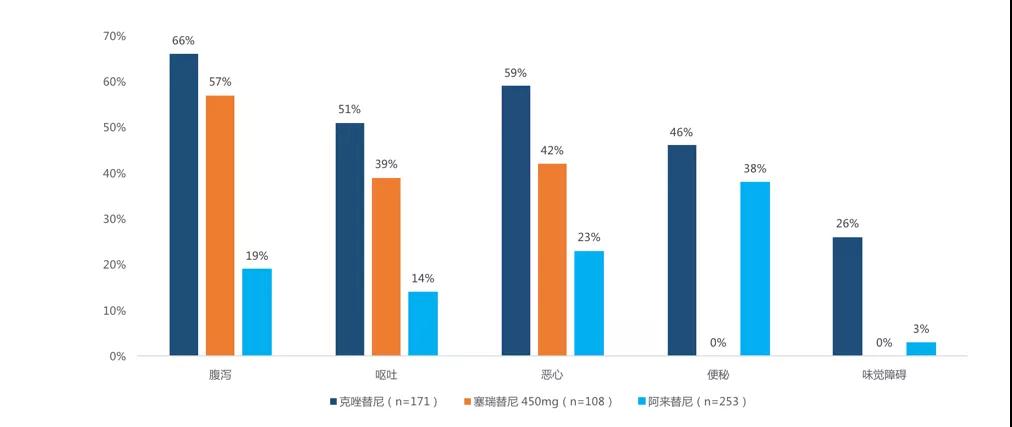 图2. 一塞瑞替尼450mg随餐,腹泻/恶心/呕吐发生率低于克唑替尼;