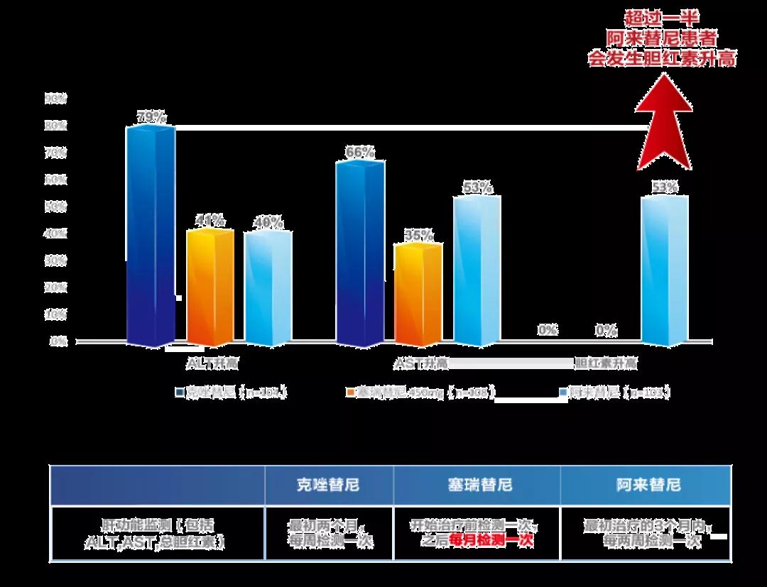因此,综合考虑,在我国这两种药物均应作为晚期ALK阳性NSCLC患者的一线选择。在临床药物选择时,需结合临床研究各个层面的数据和临床实践,为病人选择最合适的药物。不同ALK抑制剂不良反应不一样,在药物选择时,应尽可能规避加重不良反应的因素。例如,基线存在肝功能异常的患者,尽可能避免克唑替尼;而使用阿来替尼的患者,会有胆红素升高的风险;塞瑞替尼主要是胃肠道反应,但其450mg随餐服用耐受性良好。因此,要为合适的病人选择合适的药物。
